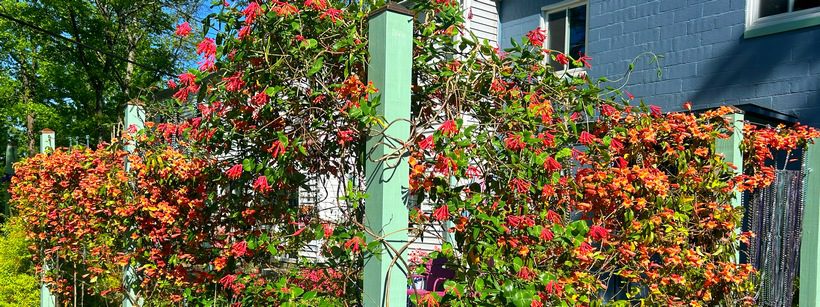 Another photo that I stopped to enjoy shows lots more crossvine blooms, plus the similarly colored blooms of ‘Major Wheeler’ coral honeysuckle in the center. I uploaded this photo as my new Facebook profile image, explaining to followers that it’s COMING SOON in real life. (Sorry, I’m in an all-caps mood.)